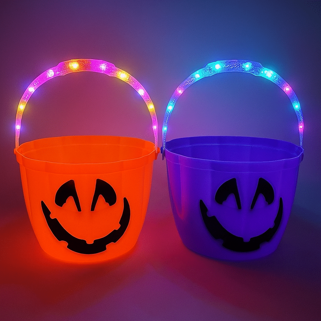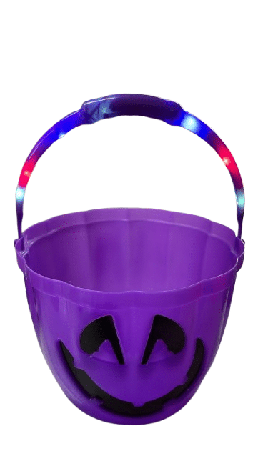 Balde de 21cm diametro caramelera calabaza violeta halloween mango con luz x1