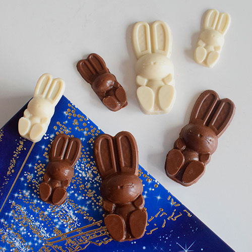 Set de 2 Moldes Placas para realizar conejitos de chocolate en tamaños grande y chico.